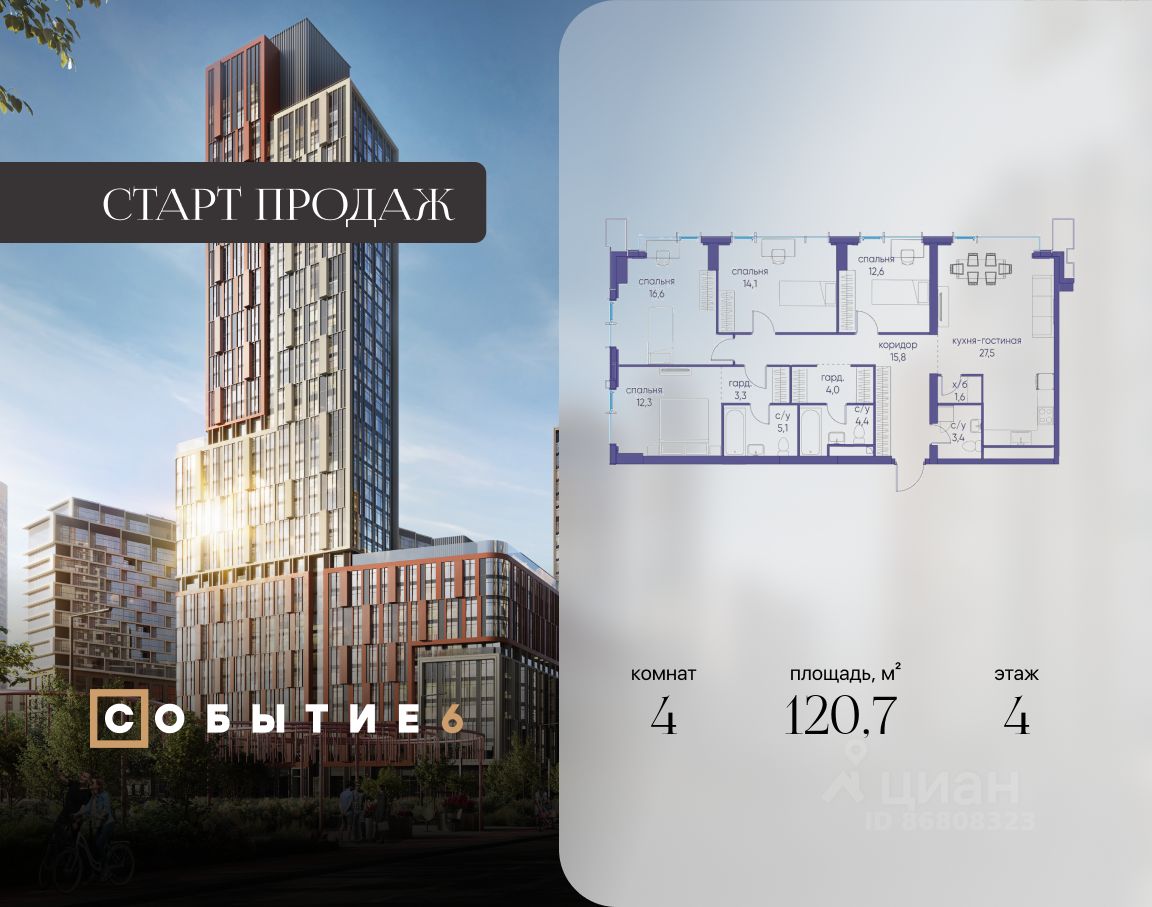 Продаётся 4-комнатная квартира от застройщика: общая площадь 120.70 м², жилая 55.60 м², кухня 27.50 м², 4-й этаж, жилой квартал "Событие-6", корпус 2 (секция 5) Срок сдачи: 1 квартал 2029 года.