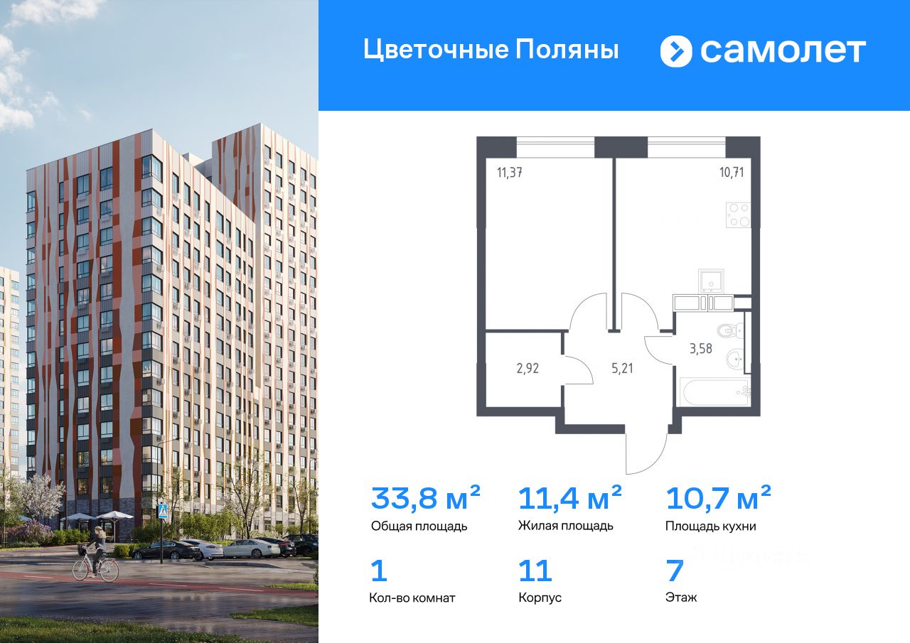 Строим кварталы для жизни с заботой о будущем. Предлагается 1-комнатная квартира комфорт-класса 33,79 кв.м в корпусе 11 на 7 этаже, в ЖК "Цветочные Поляны"