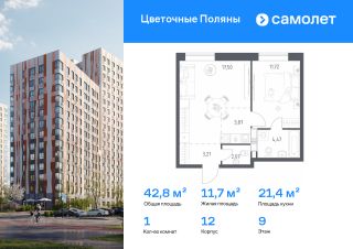 Строим кварталы для жизни с заботой о будущем. Предлагается 1-комнатная квартира комфорт-класса 42,84 кв.м в корпусе 12 на 9 этаже, в ЖК "Цветочные Поляны"
