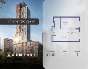Продаётся 1-комнатная квартира от застройщика: общая площадь 47.50 м², жилая 16.50 м², кухня 23.50 м², 5-й этаж, жилой квартал "Событие-6", корпус 2 (секция 1) Срок сдачи: 1 квартал 2029 года.