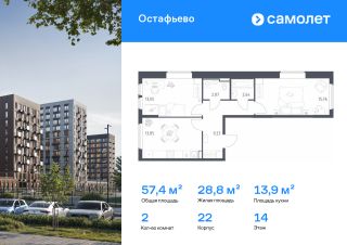Строим кварталы для жизни с заботой о будущем. Предлагается 2-комнатная квартира комфорт-класса 57,4 кв.м в корпусе 22 на 14 этаже, в ЖК "Остафьево"