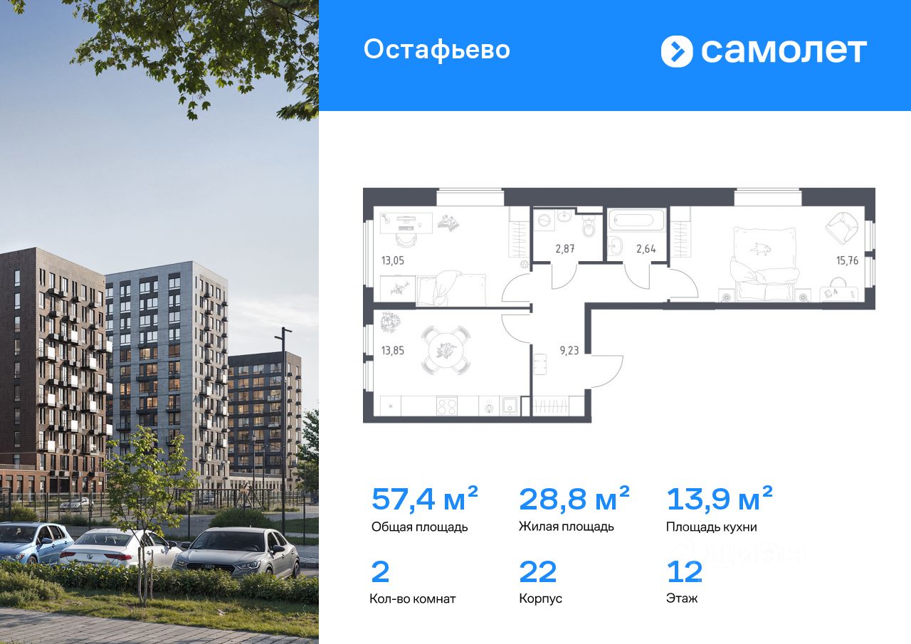 Строим кварталы для жизни с заботой о будущем. Предлагается 2-комнатная квартира комфорт-класса 57,4 кв.м в корпусе 22 на 12 этаже, в ЖК "Остафьево"