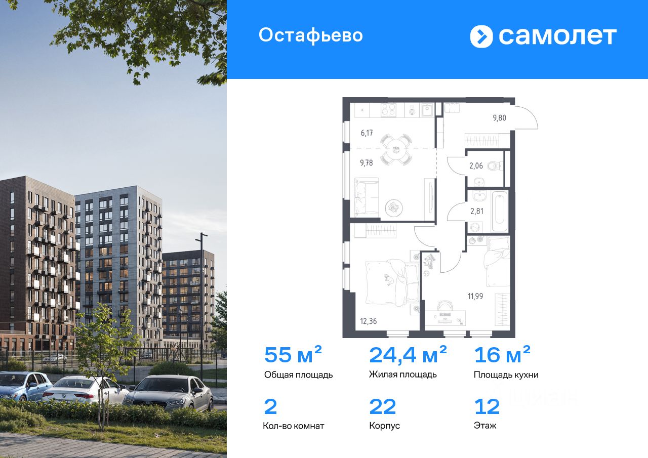 Строим кварталы для жизни с заботой о будущем. Предлагается 2-комнатная квартира комфорт-класса 54,97 кв.м в корпусе 22 на 12 этаже, в ЖК "Остафьево"