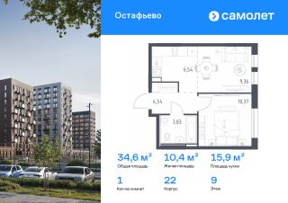 Строим кварталы для жизни с заботой о будущем. Предлагается 1-комнатная квартира комфорт-класса 34,64 кв.м в корпусе 22 на 9 этаже, в ЖК "Остафьево"