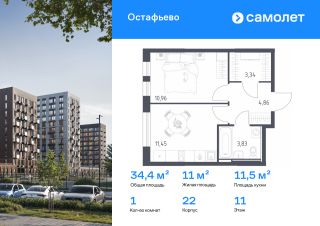 Строим кварталы для жизни с заботой о будущем. Предлагается 1-комнатная квартира комфорт-класса 34,44 кв.м в корпусе 22 на 11 этаже, в ЖК "Остафьево"