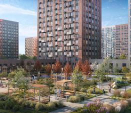 В квартале — монолитные дома комфортной высоты, от 10 этажей. Светлые фасады украшают кирпичные вставки в теплых природных оттенках.