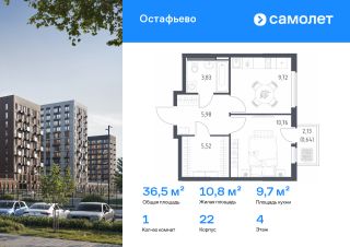 Строим кварталы для жизни с заботой о будущем. Предлагается 1-комнатная квартира комфорт-класса 36,45 кв.м в корпусе 22 на 4 этаже, в ЖК "Остафьево"