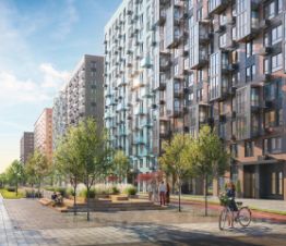 В квартале — монолитные дома комфортной высоты, от 10 этажей. Светлые фасады украшают кирпичные вставки в теплых природных оттенках.