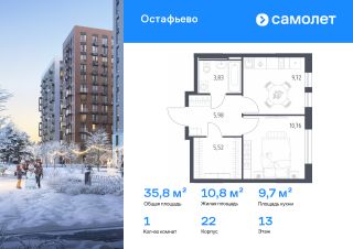 Строим кварталы для жизни с заботой о будущем. Предлагается 1-комнатная квартира комфорт-класса 35,81 кв.м в корпусе 22 на 13 этаже, в ЖК "Остафьево"