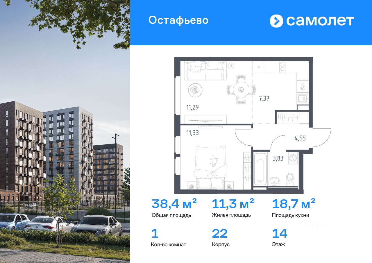 Строим кварталы для жизни с заботой о будущем. Предлагается 1-комнатная квартира комфорт-класса 38,37 кв.м в корпусе 22 на 14 этаже, в ЖК "Остафьево"