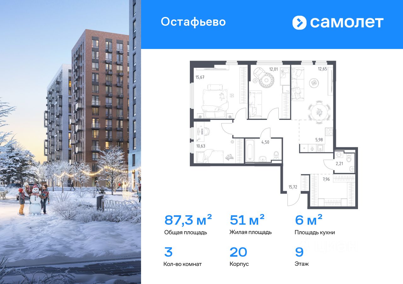 Строим кварталы для жизни с заботой о будущем. Предлагается 3-комнатная квартира комфорт-класса 87,33 кв.м в корпусе 20 на 9 этаже, в ЖК "Остафьево"
