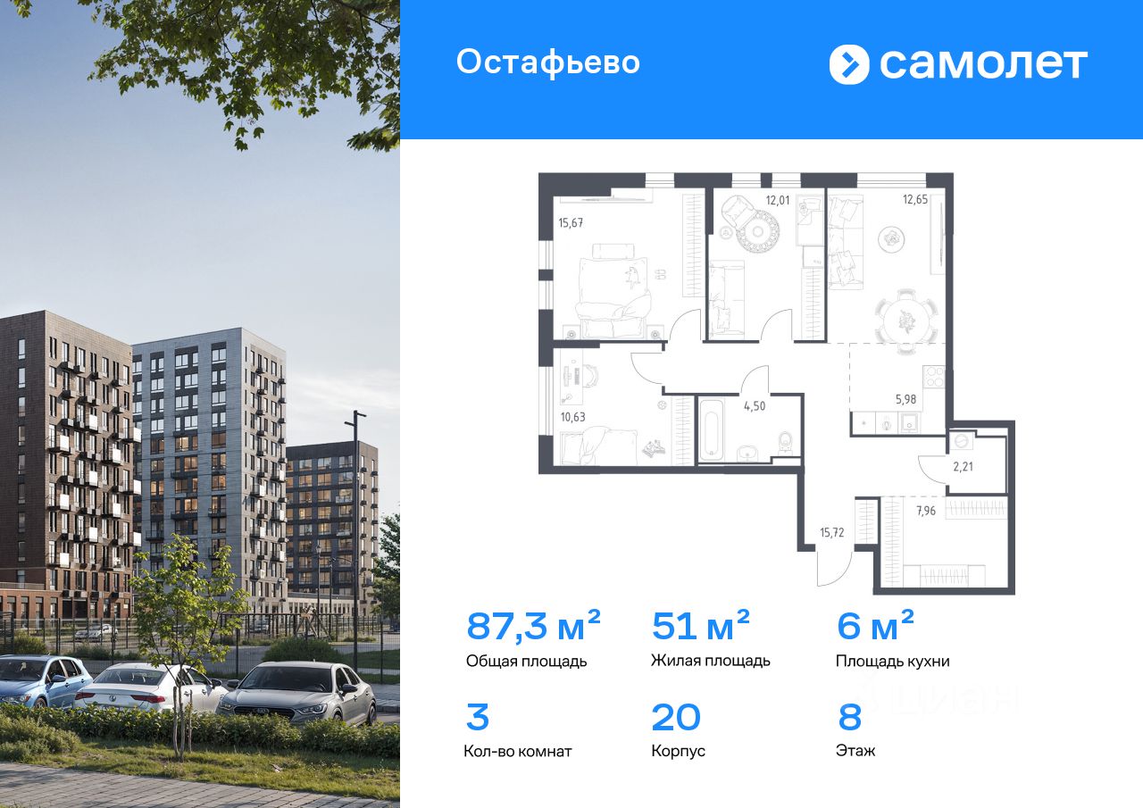 Строим кварталы для жизни с заботой о будущем. Предлагается 3-комнатная квартира комфорт-класса 87,33 кв.м в корпусе 20 на 8 этаже, в ЖК "Остафьево"