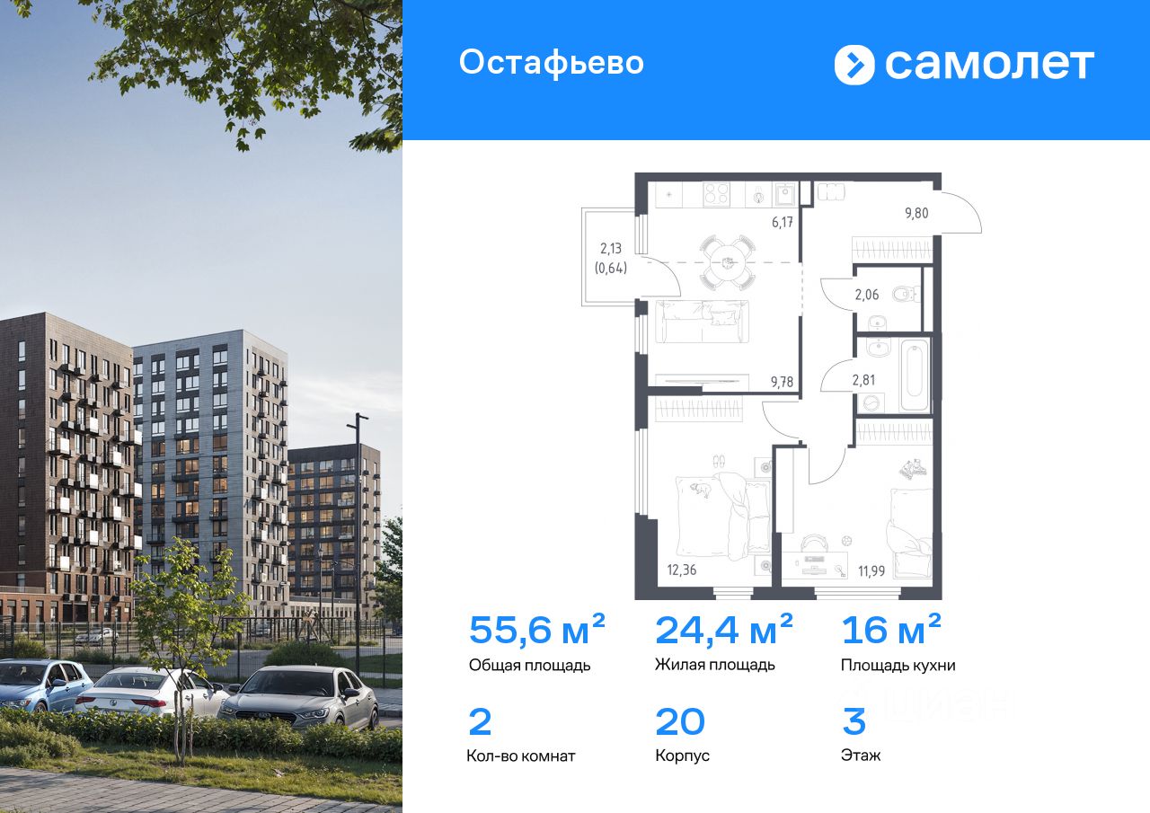 Строим кварталы для жизни с заботой о будущем. Предлагается 2-комнатная квартира комфорт-класса 55,61 кв.м в корпусе 20 на 3 этаже, в ЖК "Остафьево"