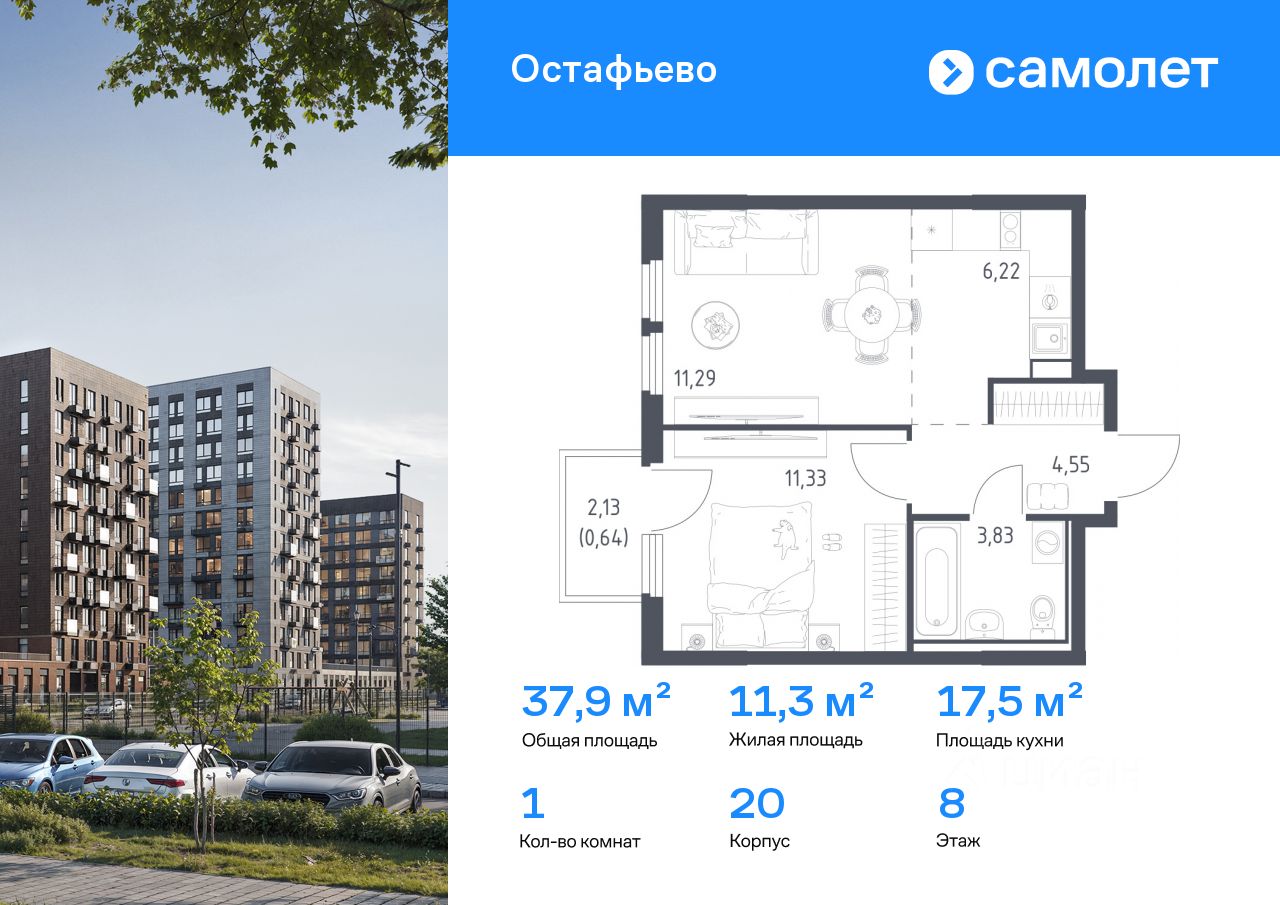 Строим кварталы для жизни с заботой о будущем. Предлагается 1-комнатная квартира комфорт-класса 37,86 кв.м в корпусе 20 на 8 этаже, в ЖК "Остафьево"