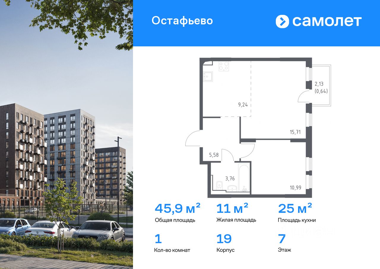 Строим кварталы для жизни с заботой о будущем. Предлагается 1-комнатная квартира комфорт-класса 45,92 кв.м в корпусе 19 на 7 этаже, в ЖК "Остафьево"