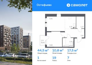 Строим кварталы для жизни с заботой о будущем. Предлагается 1-комнатная квартира комфорт-класса 44,5 кв.м в корпусе 19 на 7 этаже, в ЖК "Остафьево"