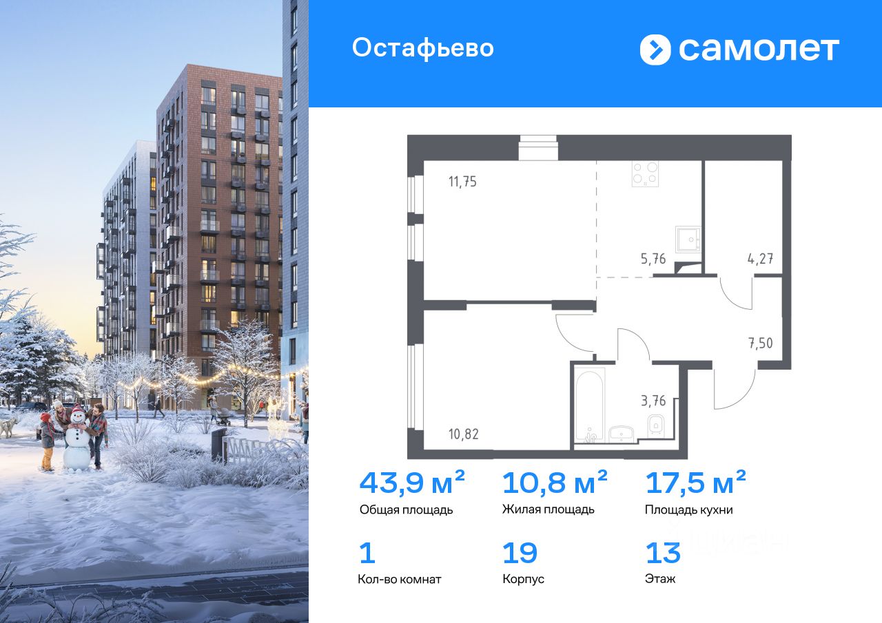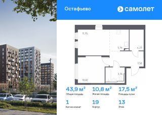 Строим кварталы для жизни с заботой о будущем. Предлагается 1-комнатная квартира комфорт-класса 43,86 кв.м в корпусе 19 на 13 этаже, в ЖК "Остафьево"