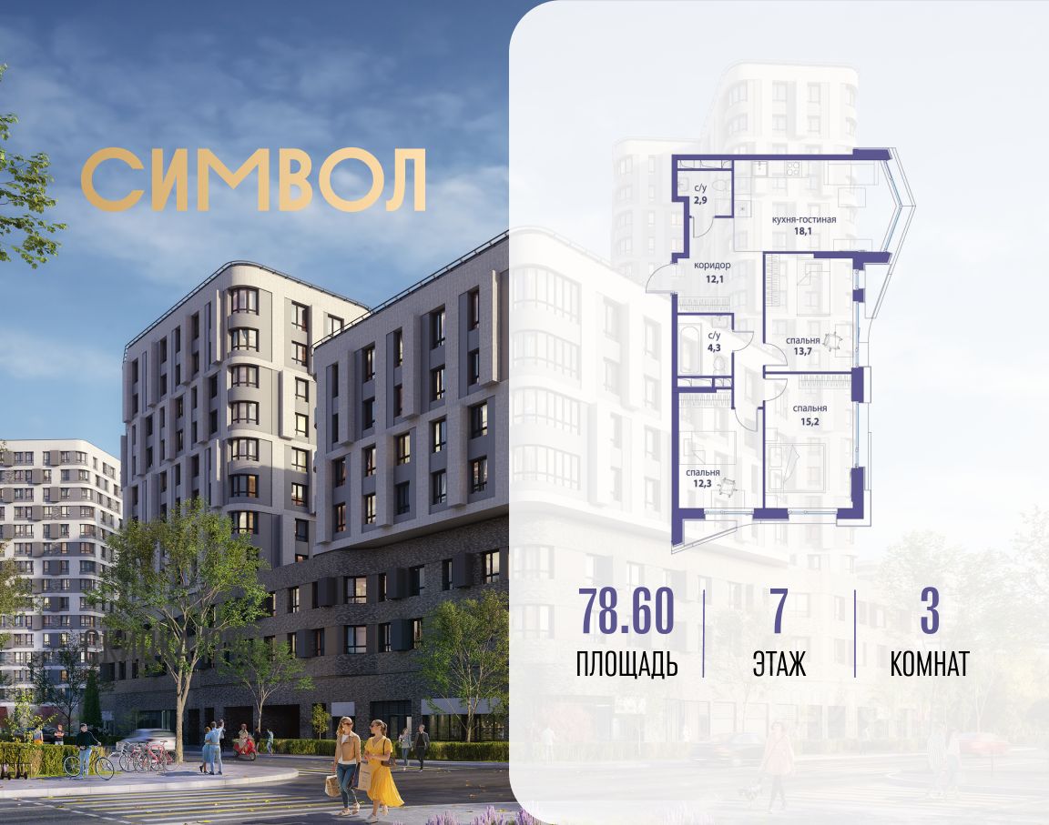 Продается 3-комнатная квартира от застройщика: общая площадь 78.60 м², жилая 41.20 м², кухня 18.10 м², 7-й этаж, жилой квартал "Вдохновение", корпус 32 (секция 1). Срок сдачи: 4 квартал 2027 года.