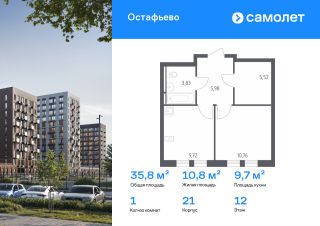 Строим кварталы для жизни с заботой о будущем. Предлагается 1-комнатная квартира комфорт-класса 35,81 кв.м в корпусе 21 на 12 этаже, в ЖК "Остафьево"
