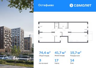 Строим кварталы для жизни с заботой о будущем. Предлагается 3-комнатная квартира комфорт-класса 74,43 кв.м в корпусе 17 на 14 этаже, в ЖК "Остафьево"