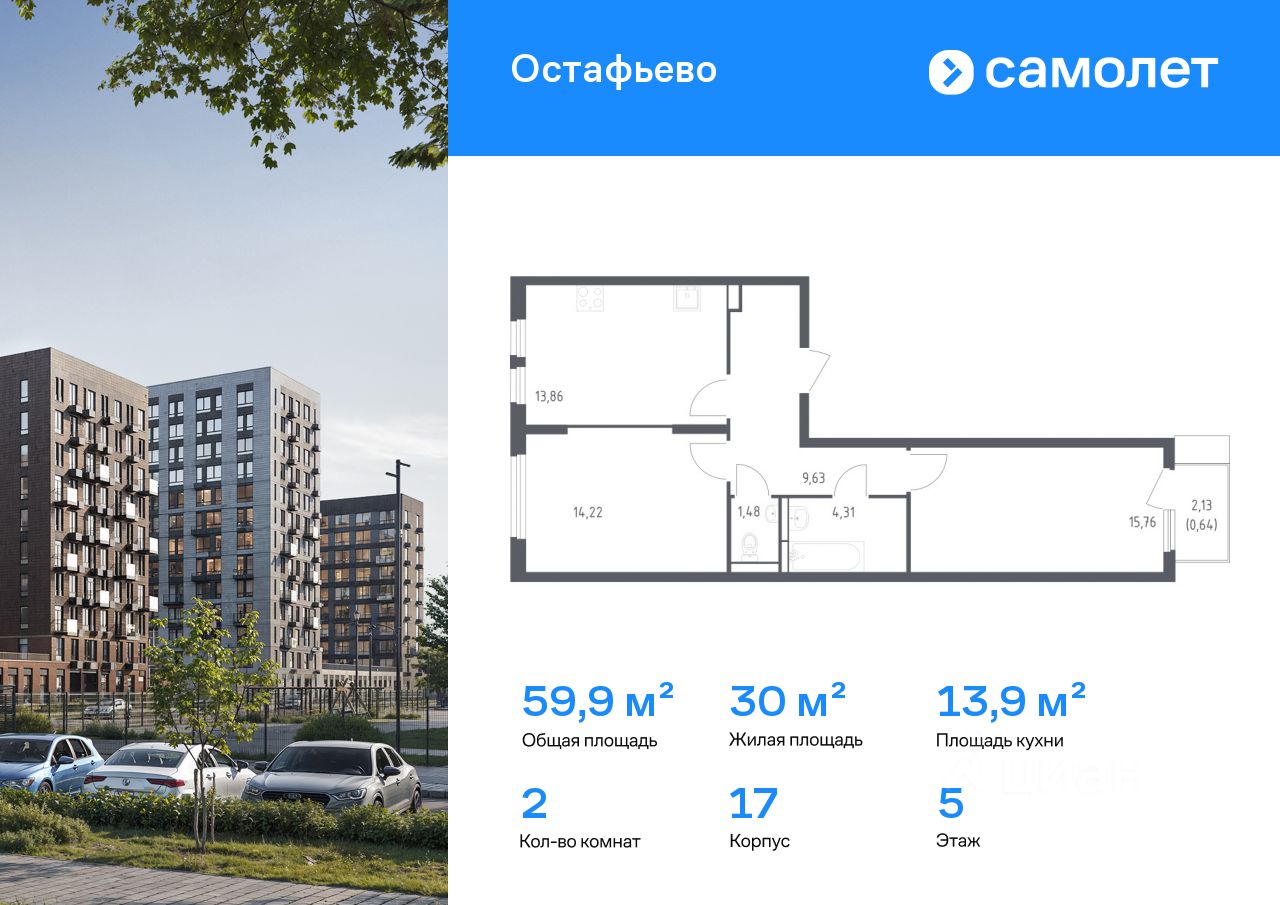 Строим кварталы для жизни с заботой о будущем. Предлагается 2-комнатная квартира комфорт-класса 59,9 кв.м в корпусе 17 на 5 этаже, в ЖК "Остафьево"