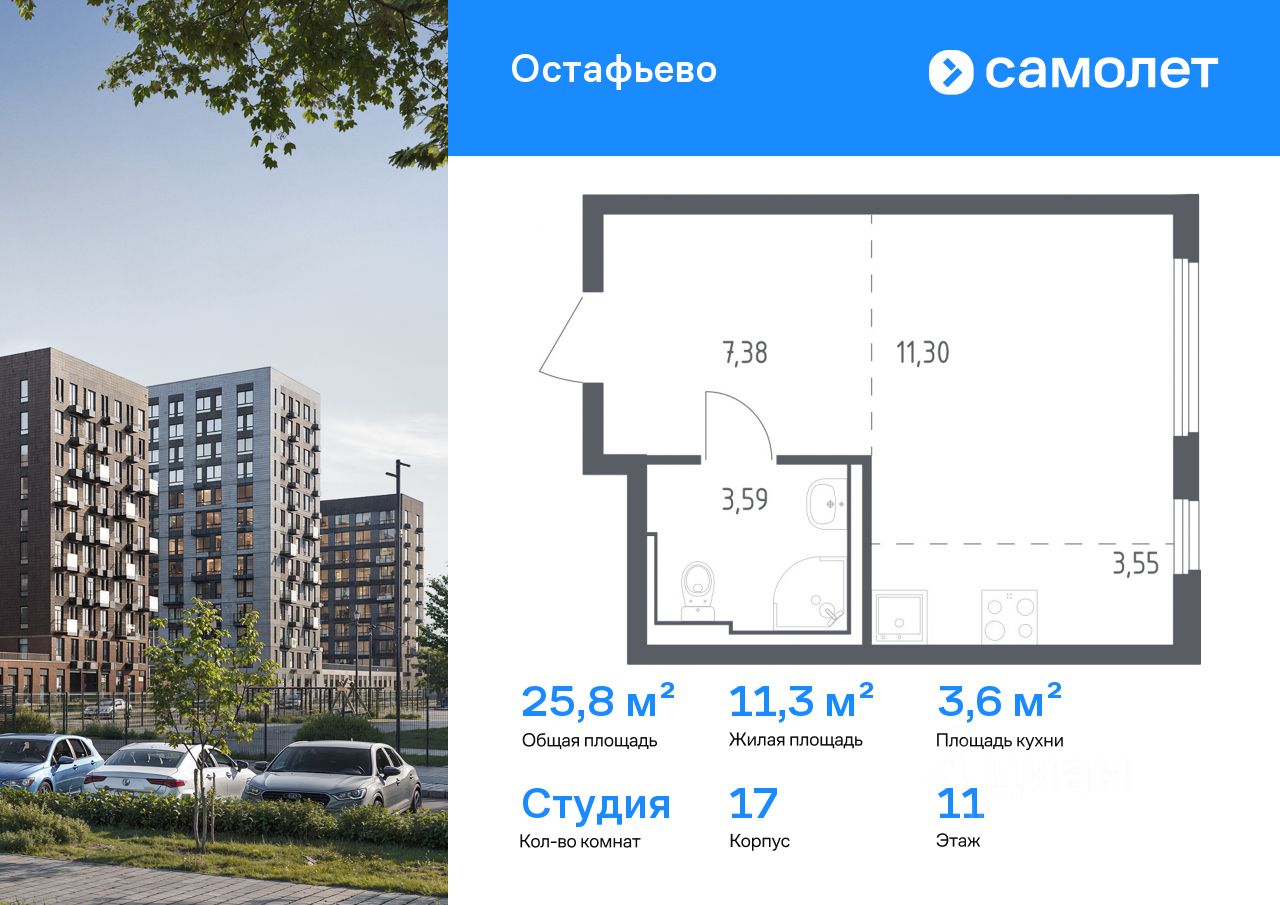 Строим кварталы для жизни с заботой о будущем. Предлагается квартира студия комфорт-класса 25,82 кв.м в корпусе 17 на 11 этаже, в ЖК "Остафьево"