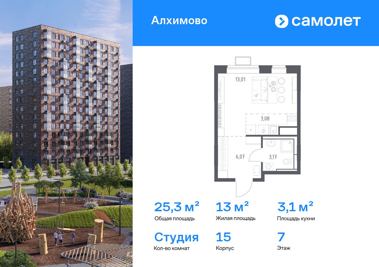 Строим кварталы для жизни с заботой о будущем. Предлагается квартира студия комфорт-класса 25,3 кв.м в корпусе 15 на 7 этаже, в ЖК "Алхимово"
