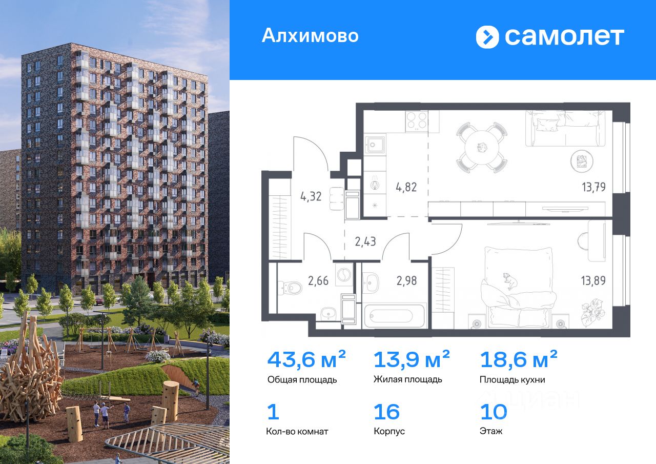 Строим кварталы для жизни с заботой о будущем. Предлагается 1-комнатная квартира комфорт-класса 43,6 кв.м в корпусе 16 на 10 этаже, в ЖК "Алхимово"