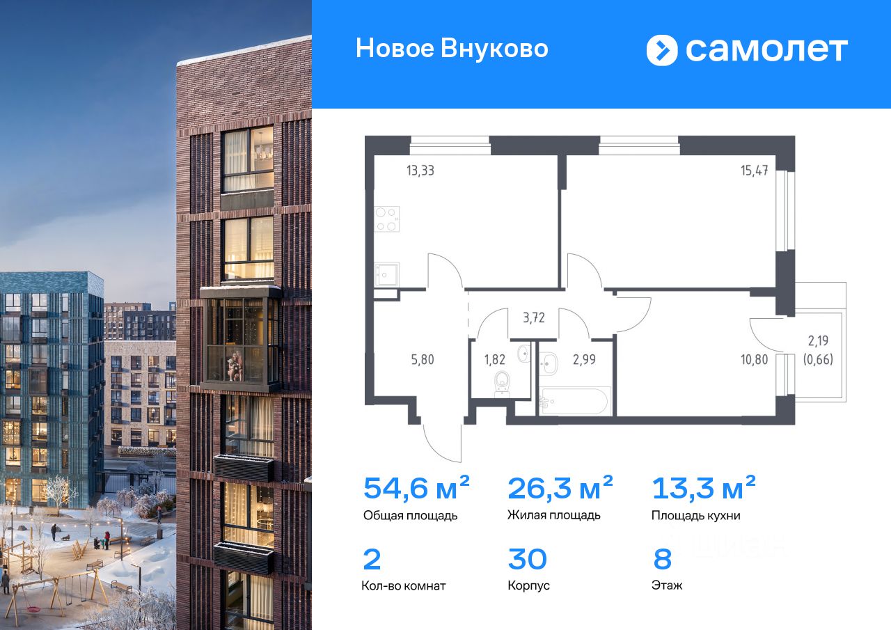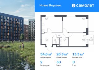 Строим кварталы для жизни с заботой о будущем. Предлагается 2-комнатная квартира комфорт-класса 54,59 кв.м в корпусе 30 на 8 этаже, в ЖК "Новое Внуково"