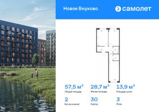 Строим кварталы для жизни с заботой о будущем. Предлагается 2-комнатная квартира комфорт-класса 57,45 кв.м в корпусе 30 на 3 этаже, в ЖК "Новое Внуково"