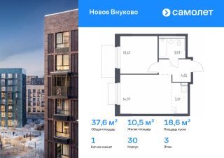 Строим кварталы для жизни с заботой о будущем. Предлагается 1-комнатная квартира комфорт-класса 37,57 кв.м в корпусе 30 на 3 этаже, в ЖК "Новое Внуково"