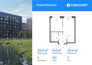 Строим кварталы для жизни с заботой о будущем. Предлагается 1-комнатная квартира комфорт-класса 32,35 кв.м в корпусе 30 на 7 этаже, в ЖК "Новое Внуково"