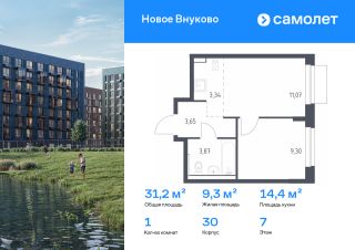 Строим кварталы для жизни с заботой о будущем. Предлагается 1-комнатная квартира комфорт-класса 31,23 кв.м в корпусе 30 на 7 этаже, в ЖК "Новое Внуково"