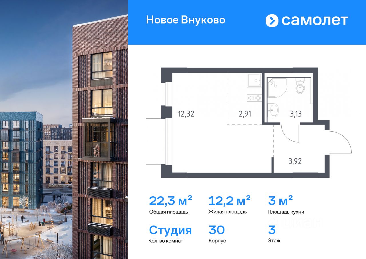 Строим кварталы для жизни с заботой о будущем. Предлагается квартира студия комфорт-класса 22,28 кв.м в корпусе 30 на 3 этаже, в ЖК "Новое Внуково"