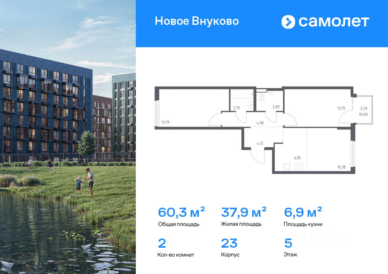 Строим кварталы для жизни с заботой о будущем. Предлагается 2-комнатная квартира комфорт-класса 60,26 кв.м в корпусе 23 на 5 этаже, в ЖК "Новое Внуково"