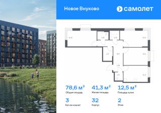 Строим кварталы для жизни с заботой о будущем. Предлагается 3-комнатная квартира комфорт-класса 78,56 кв.м в корпусе 32 на 2 этаже, в ЖК "Новое Внуково"