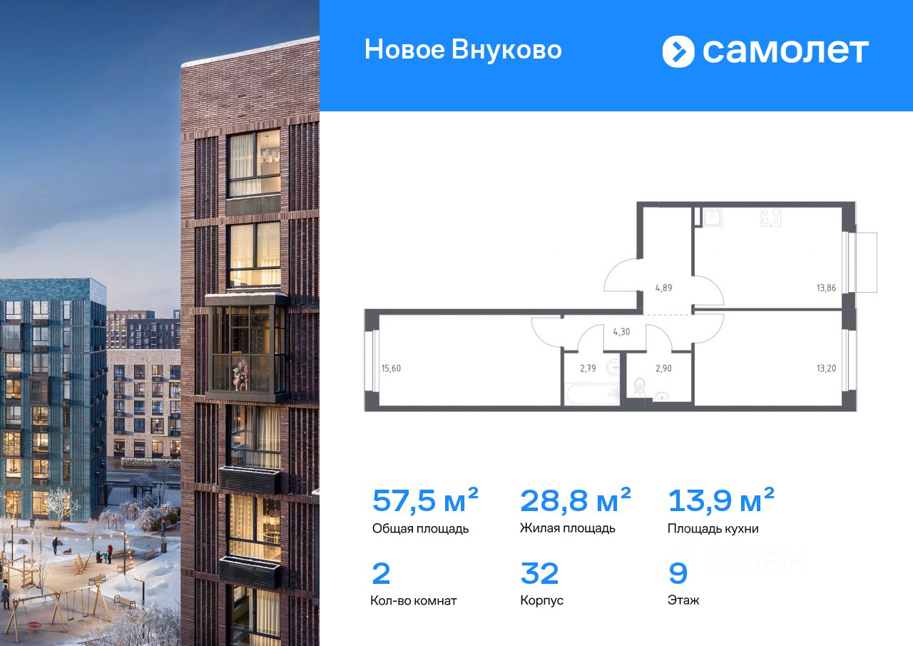 Строим кварталы для жизни с заботой о будущем. Предлагается 2-комнатная квартира комфорт-класса 57,54 кв.м в корпусе 32 на 9 этаже, в ЖК "Новое Внуково"