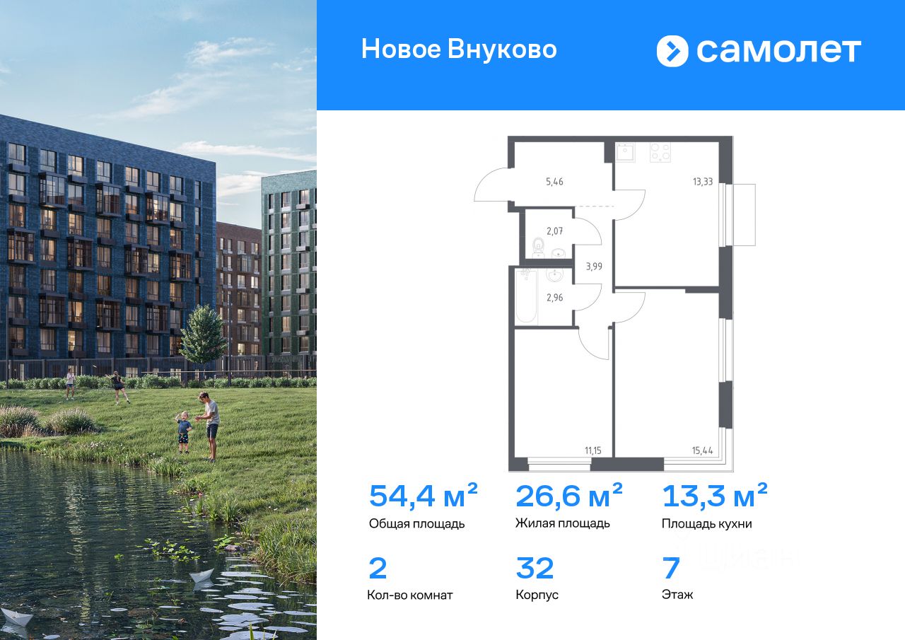 Строим кварталы для жизни с заботой о будущем. Предлагается 2-комнатная квартира комфорт-класса 54,4 кв.м в корпусе 32 на 7 этаже, в ЖК "Новое Внуково"