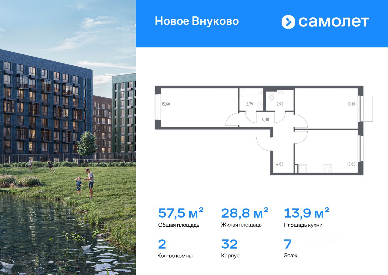 Строим кварталы для жизни с заботой о будущем. Предлагается 2-комнатная квартира комфорт-класса 57,52 кв.м в корпусе 32 на 7 этаже, в ЖК "Новое Внуково"