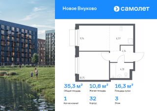 Строим кварталы для жизни с заботой о будущем. Предлагается 1-комнатная квартира комфорт-класса 35,3 кв.м в корпусе 32 на 3 этаже, в ЖК "Новое Внуково"