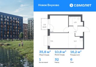 Строим кварталы для жизни с заботой о будущем. Предлагается 1-комнатная квартира комфорт-класса 35,79 кв.м в корпусе 32 на 6 этаже, в ЖК "Новое Внуково"