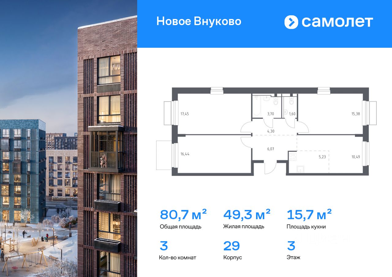 Строим кварталы для жизни с заботой о будущем. Предлагается 3-комнатная квартира комфорт-класса 80,66 кв.м в корпусе 29 на 3 этаже, в ЖК "Новое Внуково"