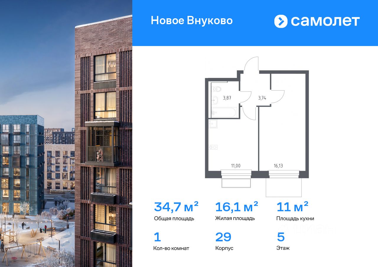 Строим кварталы для жизни с заботой о будущем. Предлагается 1-комнатная квартира комфорт-класса 34,74 кв.м в корпусе 29 на 5 этаже, в ЖК "Новое Внуково"