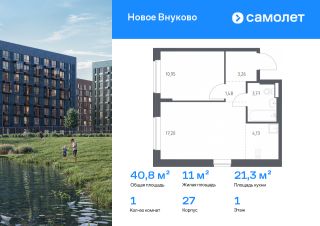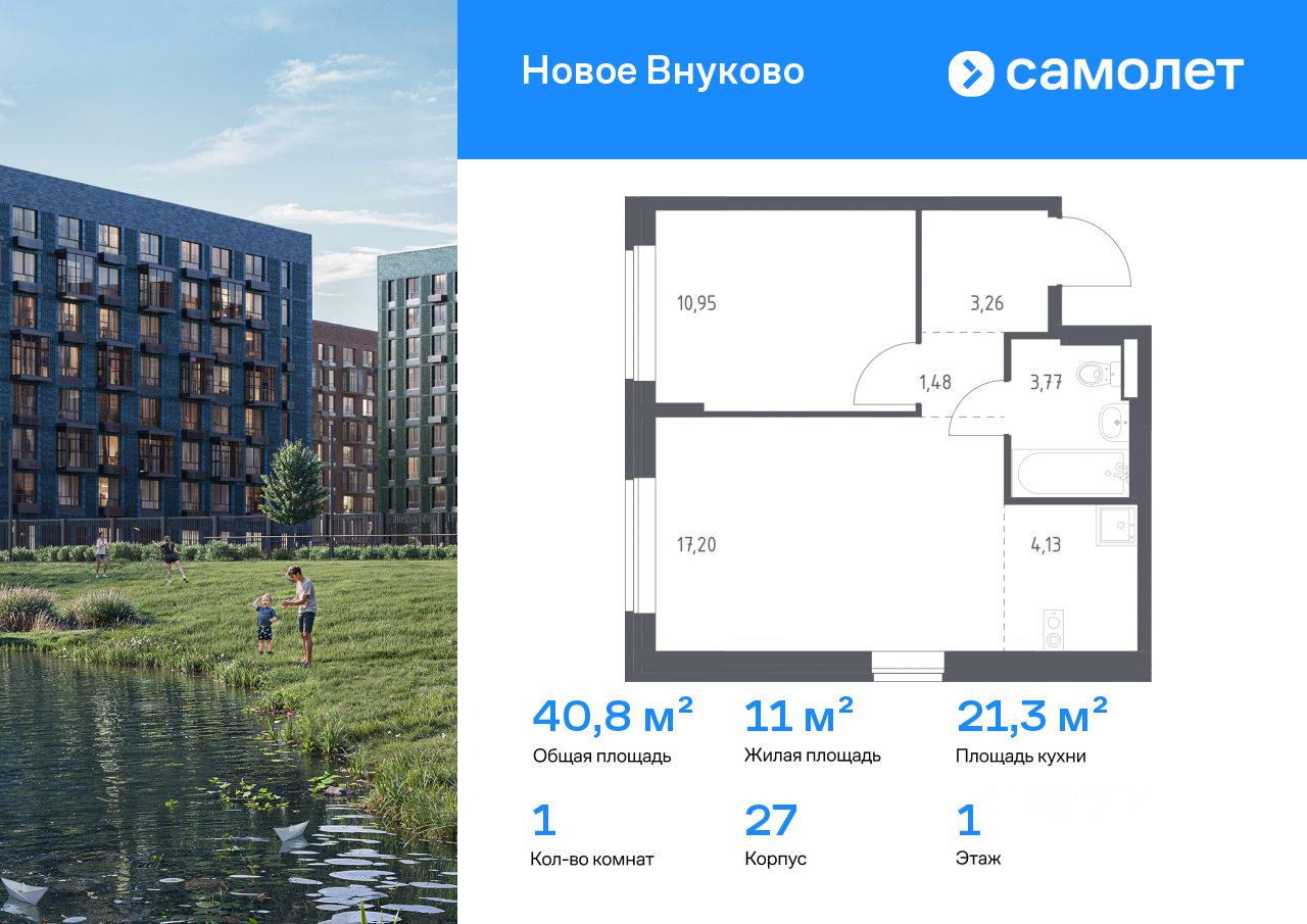 Строим кварталы для жизни с заботой о будущем. Предлагается 1-комнатная квартира комфорт-класса 40,79 кв.м в корпусе 27 на 1 этаже, в ЖК "Новое Внуково" Квартира с чистовой отделкой. Доступность дополнительных опций уточняйте у застройщика. Приобрести квартиру возможно по специальным акциям от застройщика, с текущими условиями акций можно ознакомиться в блоке "Акций". Цена динамическая и может отличаться, уточняйте актуальность у застройщика. "Новое Внуково" — это жилой комплекс в Новой Москве, у подножия берега реки Незнайка. Поблизости — живописные места для прогулок: народный парк "Ручеек", усадьба Старо-Никольское, Валуевский и Ульяновский лесопарки. Часть домов сдана и внутри района уже открыт детсад с бассейном, а в ближайшее время откроются еще 3 детсада, 2 школы и поликлиника. На территории проекта будет построен первый в России Центр Российской Федерации Баскетбола, где будут площадки с трибунами, тренажерный зал, кафе и конференц-зал. Дворы-парки закрыты от машин и посторонних. На территории — прогулочный маршрут вдоль реки Незнайка и набережная с шезлонгами и качелями для отдыха. Также здесь появится плейхаб "Незнайка на Луне", площадь для мероприятий с сухим фонтаном, летним кинотеатром и кафе. В жилом комплексе — монолитные дома высотой от 6 до 14 этажей. Фасады облицованы кирпичом природных оттенков.