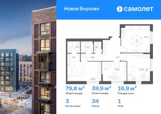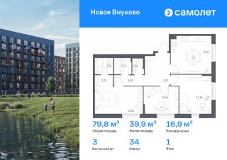 Строим кварталы для жизни с заботой о будущем. Предлагается 3-комнатная квартира комфорт-класса 79,76 кв.м в корпусе 34 на 1 этаже, в ЖК "Новое Внуково"