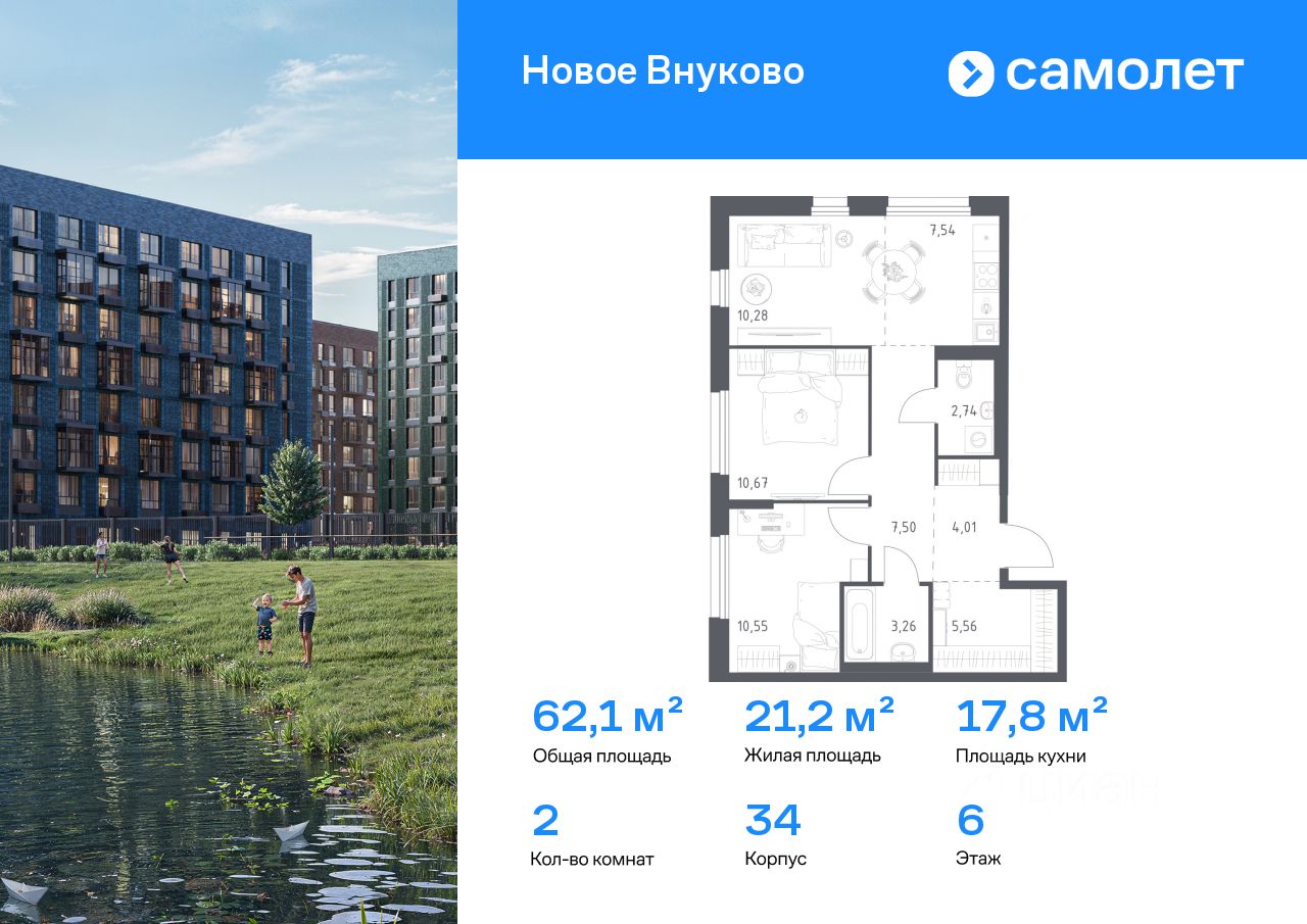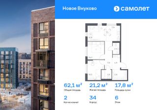 Строим кварталы для жизни с заботой о будущем. Предлагается 2-комнатная квартира комфорт-класса 62,11 кв.м в корпусе 34 на 6 этаже, в ЖК "Новое Внуково"