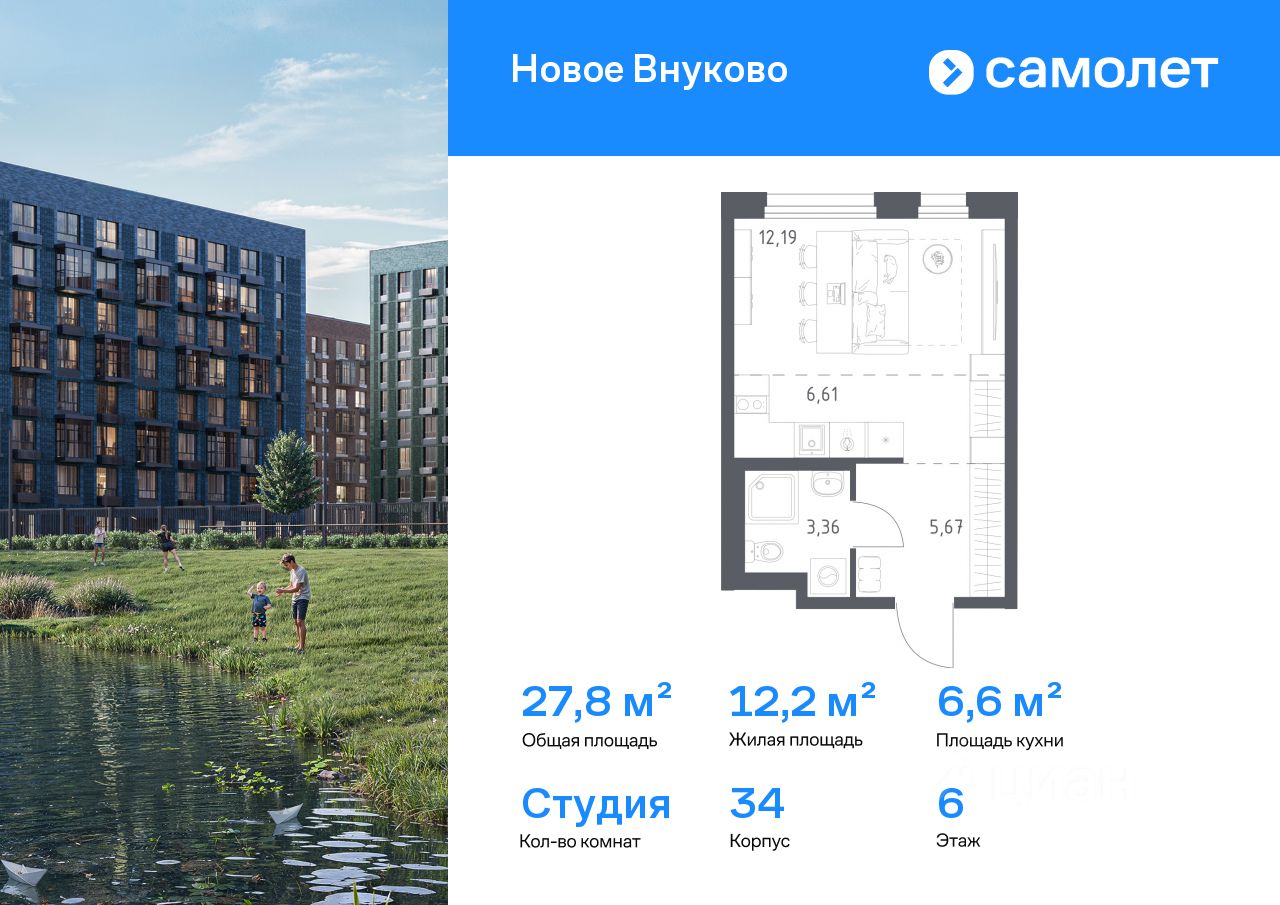 Строим кварталы для жизни с заботой о будущем. Предлагается квартира студия комфорт-класса 27,83 кв.м в корпусе 34 на 6 этаже, в ЖК "Новое Внуково"