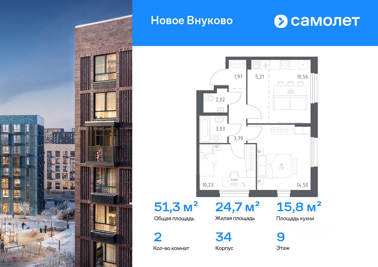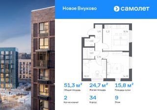 Строим кварталы для жизни с заботой о будущем. Предлагается 2-комнатная квартира комфорт-класса 51,31 кв.м в корпусе 34 на 9 этаже, в ЖК "Новое Внуково"
