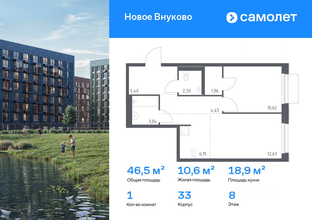 Строим кварталы для жизни с заботой о будущем. Предлагается 1-комнатная квартира комфорт-класса 46,51 кв.м в корпусе 33 на 8 этаже, в ЖК "Новое Внуково"