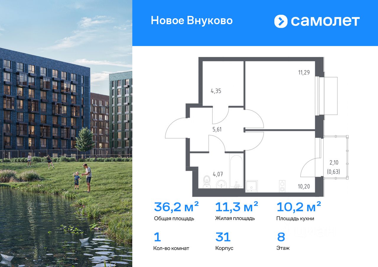 Строим кварталы для жизни с заботой о будущем. Предлагается 1-комнатная квартира комфорт-класса 36,15 кв.м в корпусе 31 на 8 этаже, в ЖК "Новое Внуково"